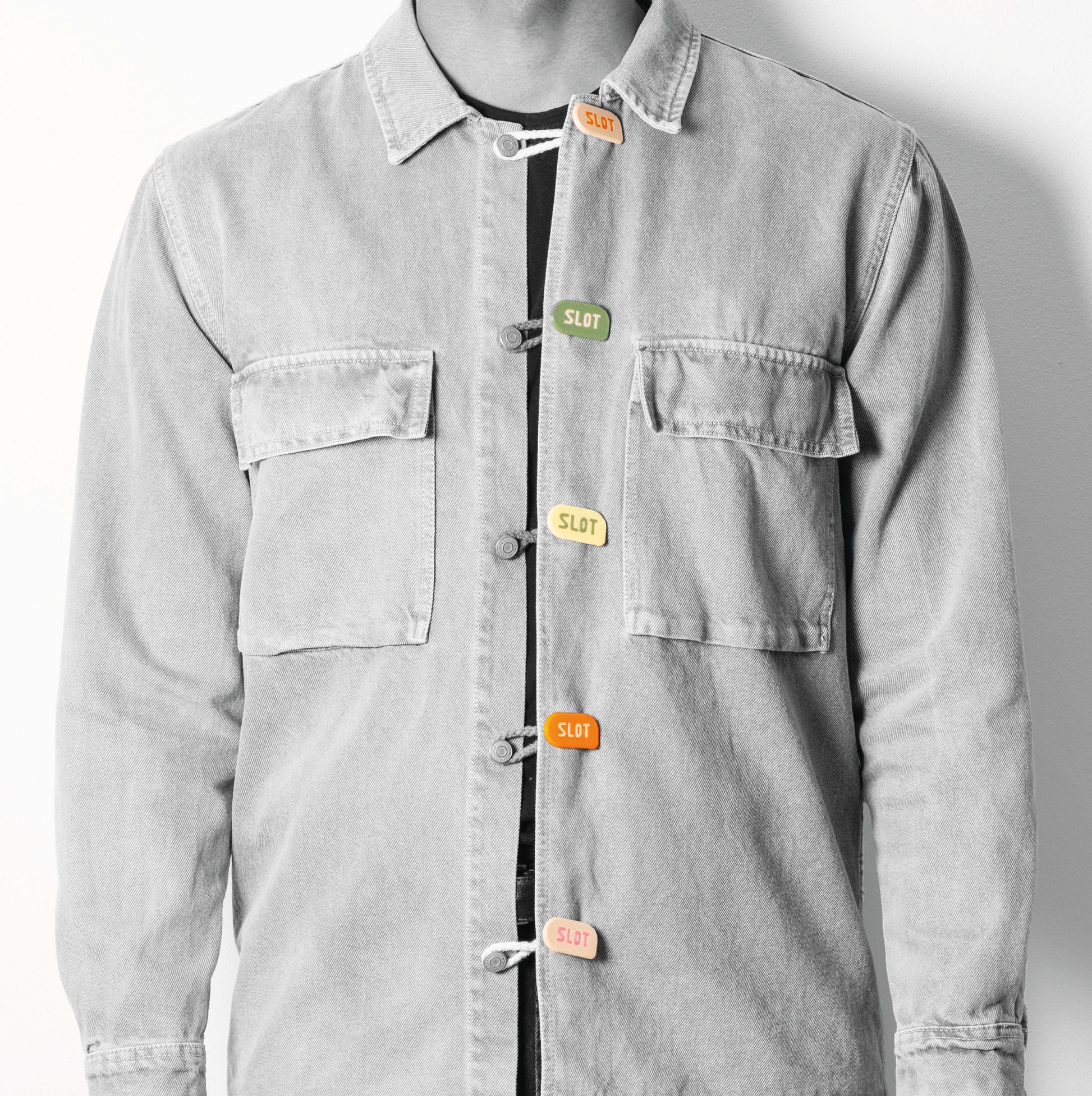 Inserisci eternamente al tuo capo il bottone SLOT nell’asola. Aggancia l’asola terminale e il gioco è fatto!